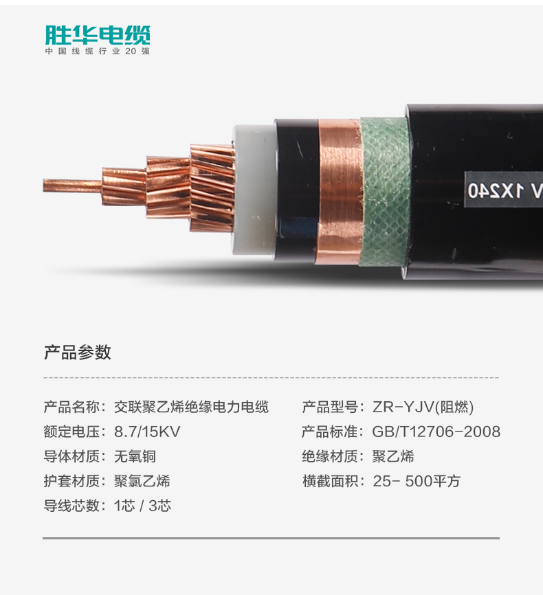 勝華電纜ZR-YJV-8.715KV中壓阻燃交聯(lián)銅芯電力電纜