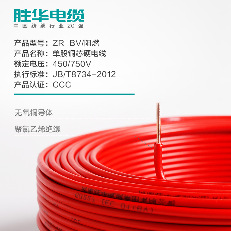 勝華阻燃電線ZR-BV-1.52.546平方國(guó)標(biāo)單股銅芯電線